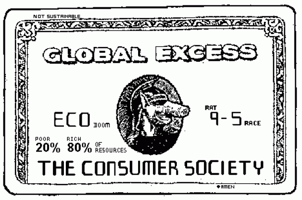In kaj storiti kot slehernik potrošnik? V vrsti pred blagajno iz merkator vodke ali hofer slivovke narediti molotovko in jo zafukat na vseh tistih petdeset vrst pakiranih narezkov za čast in slavo revolucionarnega razrednega boja? ... No, že če v štacuni kupiš tisto, po kar si prišel, je včasih uspeh. Morda pa lahko to novodobno hlapčevanje spremenimo z radikalizirano potrditvijo položaja, kamor nas vzrejajo za potrošnike, ter tako še najučinkoviteje znegiramo sceno, kot tisti žižkovski vic, ko se ženska pred vsiljivo potrebnim tipom sama začenja slačit, češ ajde, pofukaj me, njemu pa prav zaradi tega s tičem naprej vse pade dol. Groteskenje že tako grotesknih vzbujevanj potreb, novi komaj spremenjeni aparati, mašince za rezat zelenjavo, revolucionarne super vile za štihat etc. Da smrtno resno, brez distance, cinizma, zajebancije od prodajalca, proizvajalca, lastnika na masovni ravni zahtevamo še bizarnejše produkte.